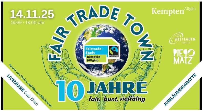 Auf einem „Markt der Möglichkeiten“ bieten der Kemptener Weltladen und piepmatz e.V. ihre fair gehandelten Waren mit einem 10-prozentigen Jubiläumsrabatt an.
